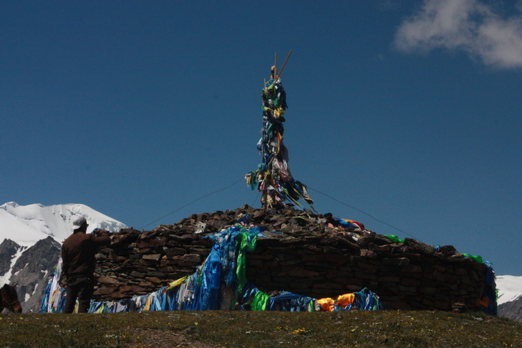 전망대 언덕에 커다란 어워가 있다. 어워는 몽골 민족의 민속 신앙 중심이다. 카자크 사람이 사는 바양-을기는 무슬림 지역이다. 이곳에 유일하게 있는 어워다. 몽골 정부는 타븡 복드 올을 국가 성산으로 지정하고, 이곳에서 4년 마다 한 번씩 천제를 올린다고 한다. 몽골인들은 어워를 돌며 기원한다. 이들은 시계 방향으로 돌며 우유나 술을 차찰(고스레) 한다. 세바퀴를 돌며 기도해야 소원이 이루어진다고 한다. 몽골 전통 델 차림의 젊은 몽골인은 어워 앞에 엎드려 진지하게 기도를 하고 있다.