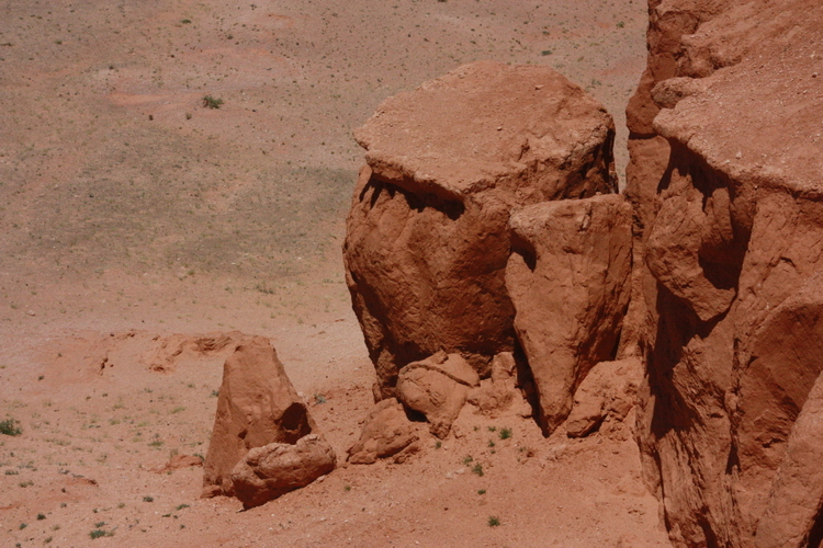 책상 판과 같은 절벽 위에서 아래로 깎여 나간 붉은 진흙 절벽이 이어져 있다. 주변이 깡그리깎여나가고 외돌개처럼 높다랗게 서 있는 진흙 더미도 있다. 비가 적은 사막이라 침식이 급격히 진행되지 않아, 그런대로 모양을 유지하고 있다. 상당한 시간 동안 이런 형태의 지형은 유지될 것이다.