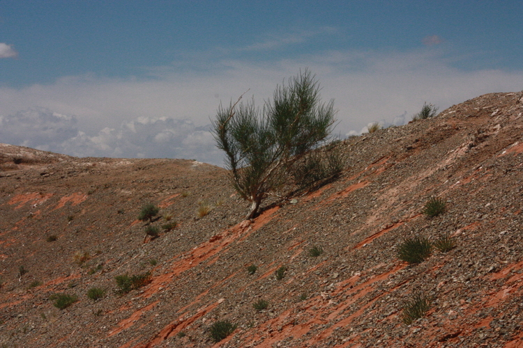 여기 이름이 바양자그인데 자그 나무숲은 보이지 않는다. 지구온난화에 의한 기후 변화로 고비에서 자그가 점점 사라지고 있다. 절벽과 길 주변에 작은 새끼 자그가 외롭게 서 있을 뿐이다.