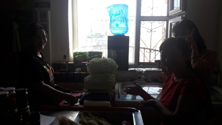 생샨드에서 가장 큰 상점인 ‘노민 델구르’ 앞에서 네 명이 만났다. 우선 회비 이만 투그릭 씩 걷고, 가장 중요한 재료 배추를 사러 갔다. 여기서는 양배추를 ‘배차’, 배추를 ‘김치 배차’라고 한다.