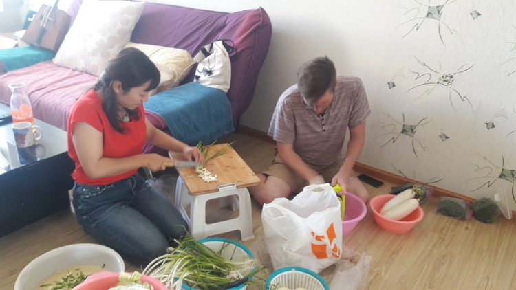 피터는 파와 무를 씻는다. 채소를 씻을 때 수돗물로 씻은 후에 정수한 물이나 생수로 다시 씻어야 한다. 몽골 수돗물은 지하수를 그냥 쓰기 때문에 금속 성분이 많이 들어 있다. 그대로 마시기에는 적합하지 않다. 마시는 물은 정수한 생수를 사다 써야 한다. 그리고 음식 재료 씻는 것도 마찬가지다. 약소하지만 코이카 활동 물품으로 나온 브리타 정수기로 정수한 물을 잔뜩 받아 놓았다가 이럴 때 사용한다.