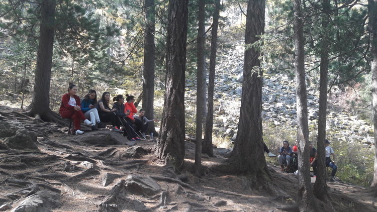 오래된 낙옆송이 쓰러져 누운 곳이 휴식터다. 아이들이 일자로 쭐러리 앉아 쉬고 있다. 산 아래 안내판에는 쉼터가 세 개 있다고 써 있다. 대략 삼십분마다 한 번씩 쉬라고 쉼터를 안내하는 것이다.