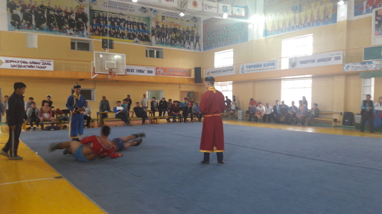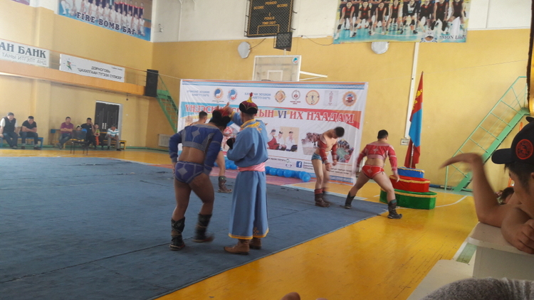 샤인샨드에는 공공 실내 체육관이 하나 있다. 관중석은 없고, 농구장 하나 정도 크기의 마루가 있다. 이 체육관에서는 거의 매일 운동 경기가 벌어진다. 몽골인들이 가장 많이 하는 운동 경기는 배구와 농구다. 학교에서 체육 시간에 배구를 많이 가르친다. 아이들이 공놀이 하는 것을 보면, 배구 토스를 제대로 하는 아이들이 더러 있다. 체육관 앞에 보고 싶었던 몽골 씨름 부크 현수막이 붙었다. 칠월에 열리는 나담 축제 예선 시합이다.