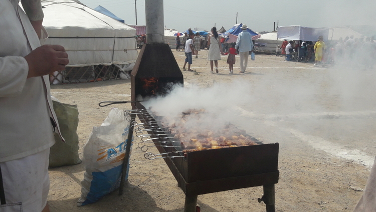 나담 먹거리 장터에서 호쇼르 이외에 다양한 먹거리가 있다. 양고기 바비큐, 철판구이, 센드위치 등이 보인다.